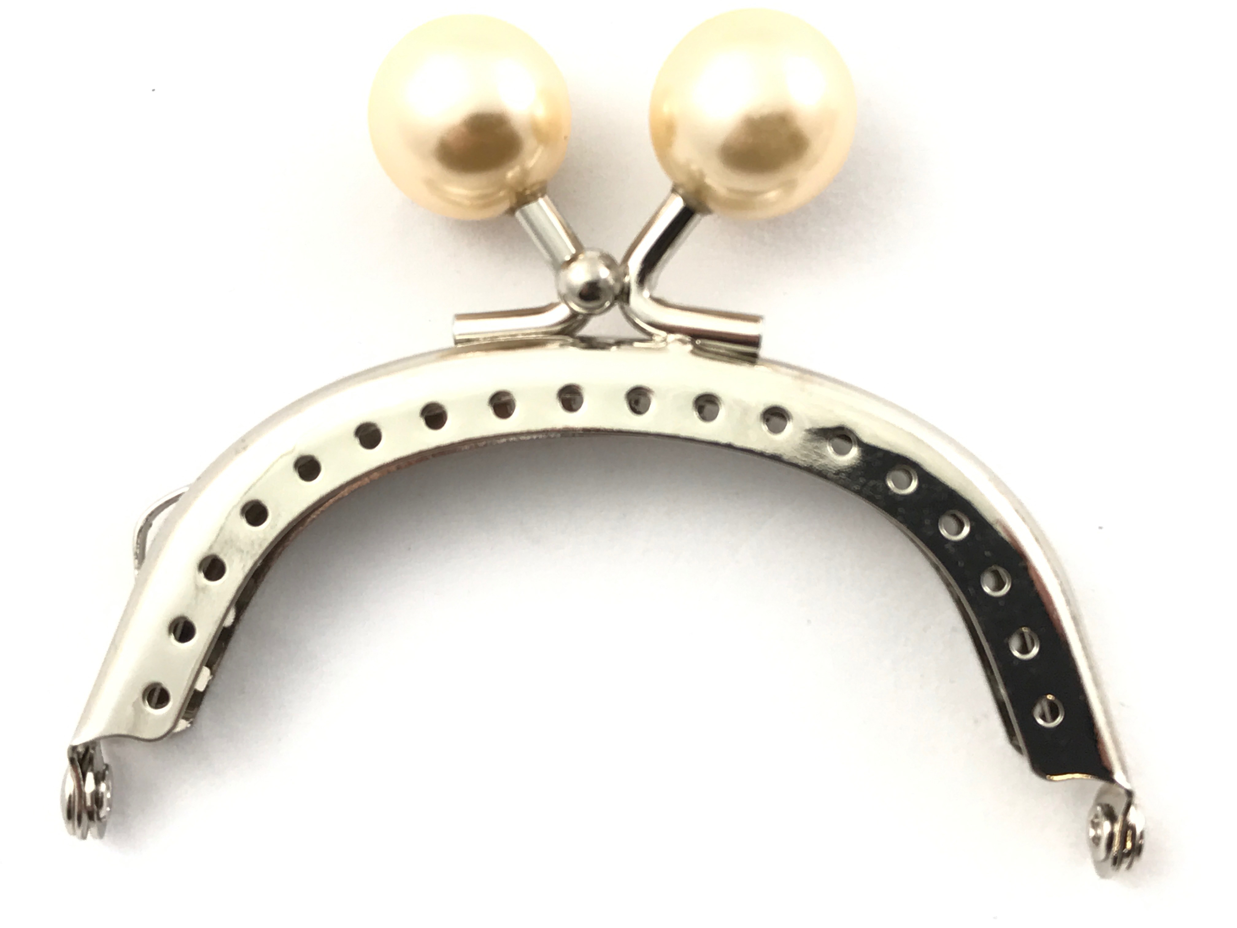 Krásný našívací kovový rámeček na kabelky nebo peněženky ve stříbrném provedení se dvěmi perlemi.