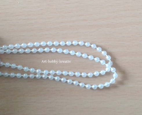 Plastové, perleťově bílé korálky na niti můžete použít k vázání dárku, ozdobu do kytic, do vlasů atd. Korálky jsou do niti zataveny.