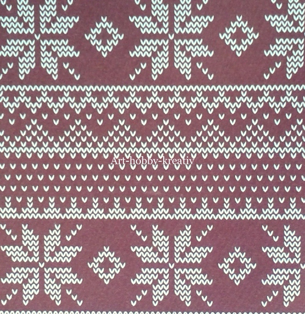 Krásný oboustranný papír s motivy rukavic na béžovém podkladu, druhá strana je pokryta motivem sněhových vloček, které vytvářejí dojem krásné norské pleteniny.