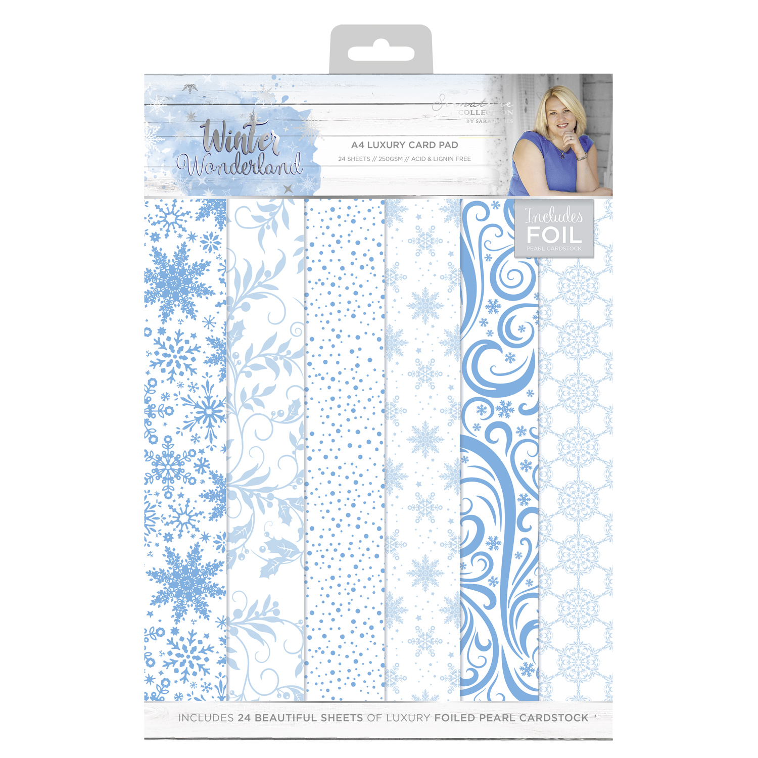 Sada luxusních jednostranných papírů se zimními motivy. Celkem 24 ks bílých papírů s perletí, embossovaných nebo v bílo stříbrné kombinaci. Přední strana těchto papírů je proto vyobrazna v modré barvě, aby bylo lépe vidět jednotlivé vzory papírů.