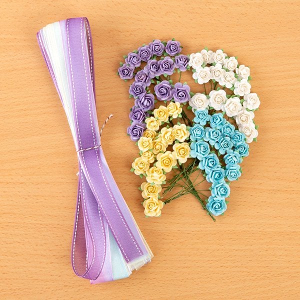 Sada jarních květů, morušových růží a stuh obsahuje 20 morušových papírových růží vbe čtyřech odstínech a cca 3 odstíny organzových stuh v délce cca 90 cm každá, celkem cca 2,70 m.