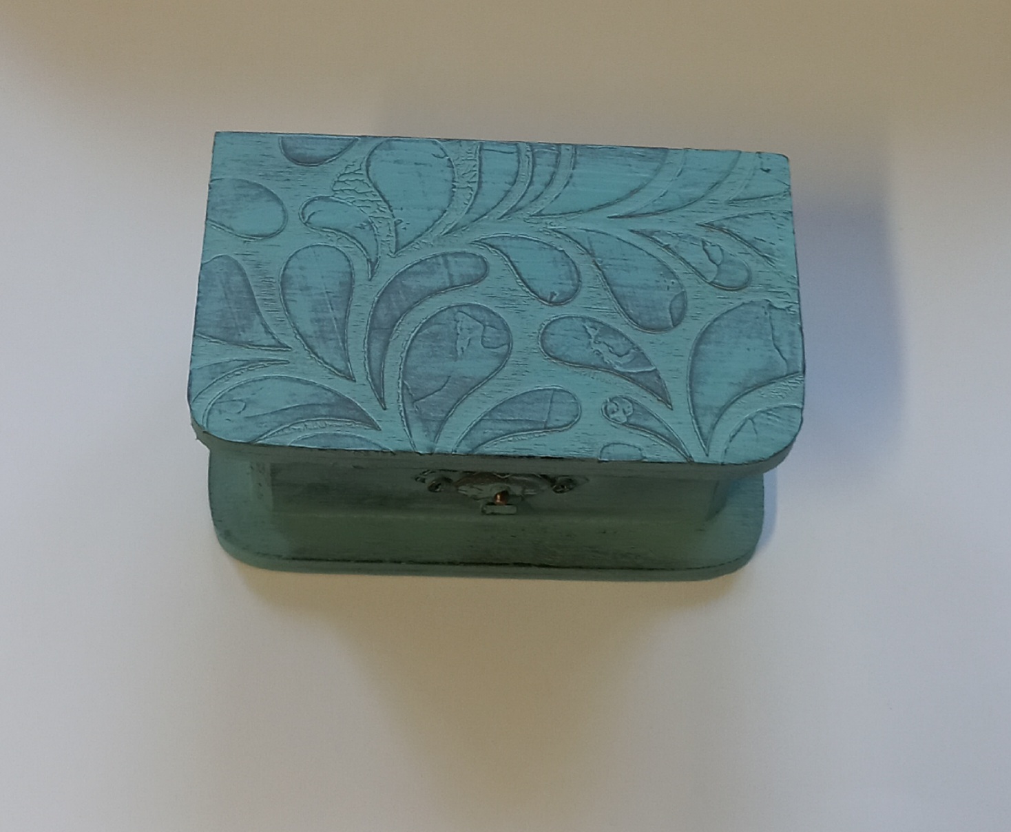 Tato obdélníková, dřevěná krabička - truhlička je opatřená kovovým zapínáním a ozdobená patinováním .