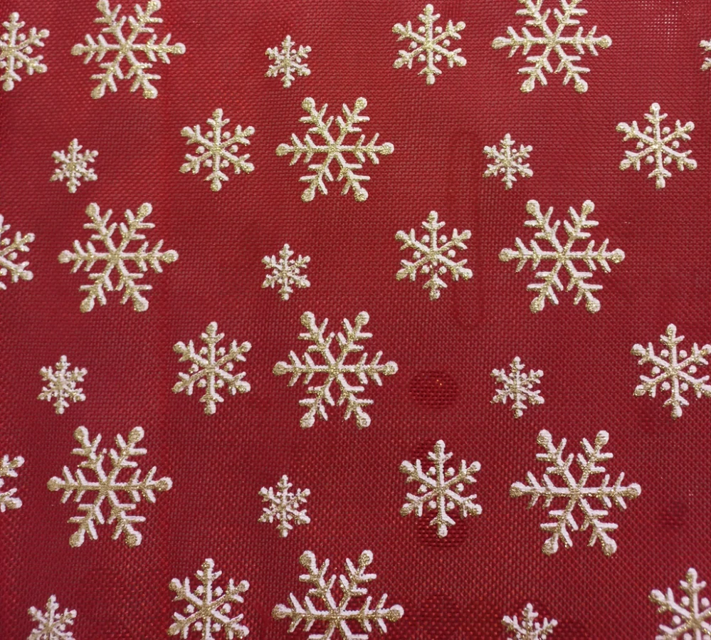 Nádherná dekorační vánoční látka s glitrovými vločkami. Tato imitace pytloviny s jednostranným potiskem, je ideální pro výrobu prostírání, ozdobných pytlíčků, štoly, ubrusu a pod. Touto látkou můžete polepit rovněž rámečky, krabičky.