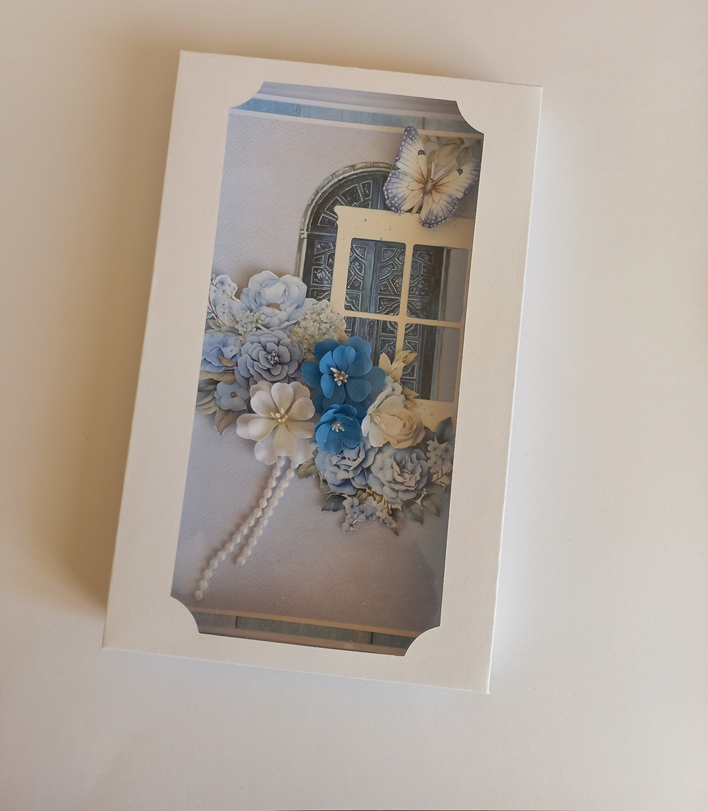 - Přání s krabičkou v jemným odstínech modré je vyrobeno z kvalitních papírových čtvrtek, doplněné ručně vyrobenými látkovými květinami.