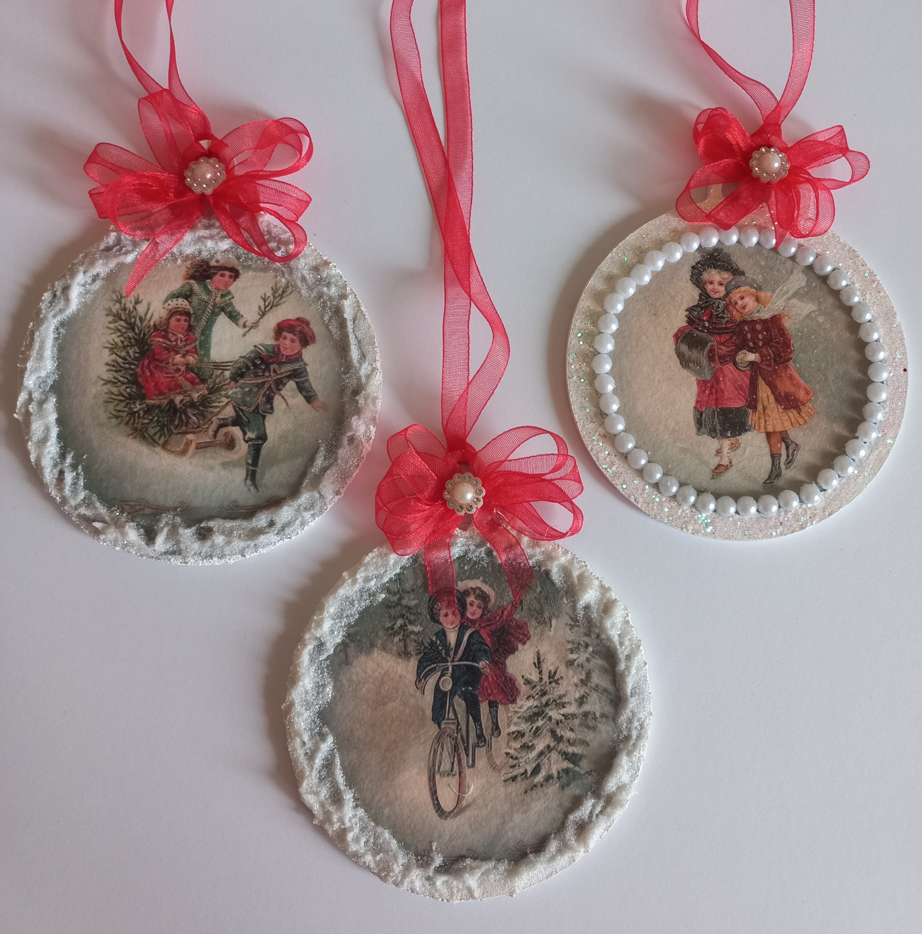 Dekorační dřevěné placky ve tvaru baňky s motivem dětí, obrázky jsou chráněné lakem. Zadní strana je opatřena scrapbookovým papírem.