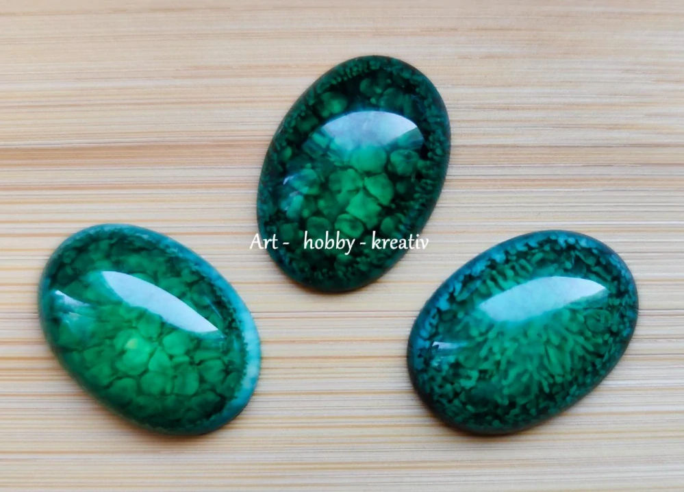 Plastový kabošon zelený, oválný. Vhodný k nalepení či obšití. Každý kabošon má jinou kresbu.